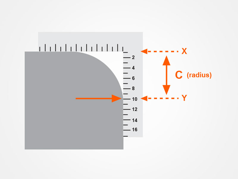 Mikäli altaassa on pyöristetyt kulmat, kannen valmistamista varten on tarve tietää kulman pyöristyksen suuruus eli ympyrän säde (radius). Helpoin tapa mitata radius on käyttämällä suorakulmaa. Mittaa X ja Y välinen etäisyys.